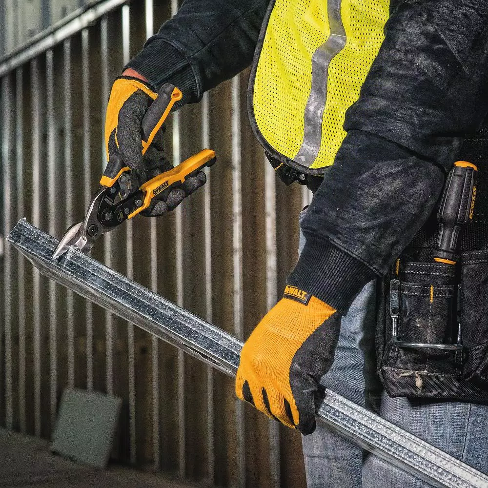 The DEWALT Ergo Aviation snip was designed with a reduced handle span, providing lower level of muscle effort required while cutting tough materials. This tool is traditionally used for cutting aluminum, vinyl siding, screening, cardboard, leather, copper and 18-Gauge to 22-Gauge sheet metal. The snip’s serrated cutting edge prevent materials from slipping during use and the slip-resistant, bi-material cushion grip ensures a firm, comfortable grip.