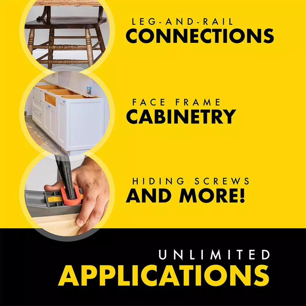 - Includes adjustable pocket hole jig, 3/8 in. step drill bit, 3/8 in. steel stop collar, hex wrench, 6 in. square drive bit, 24-3/8 in. wood plugs, 12-1 in. fine and coarse thread screws, 12-1-1/2 in. fine and coarse thread screws, 12-2 in. coarse thread screws and case