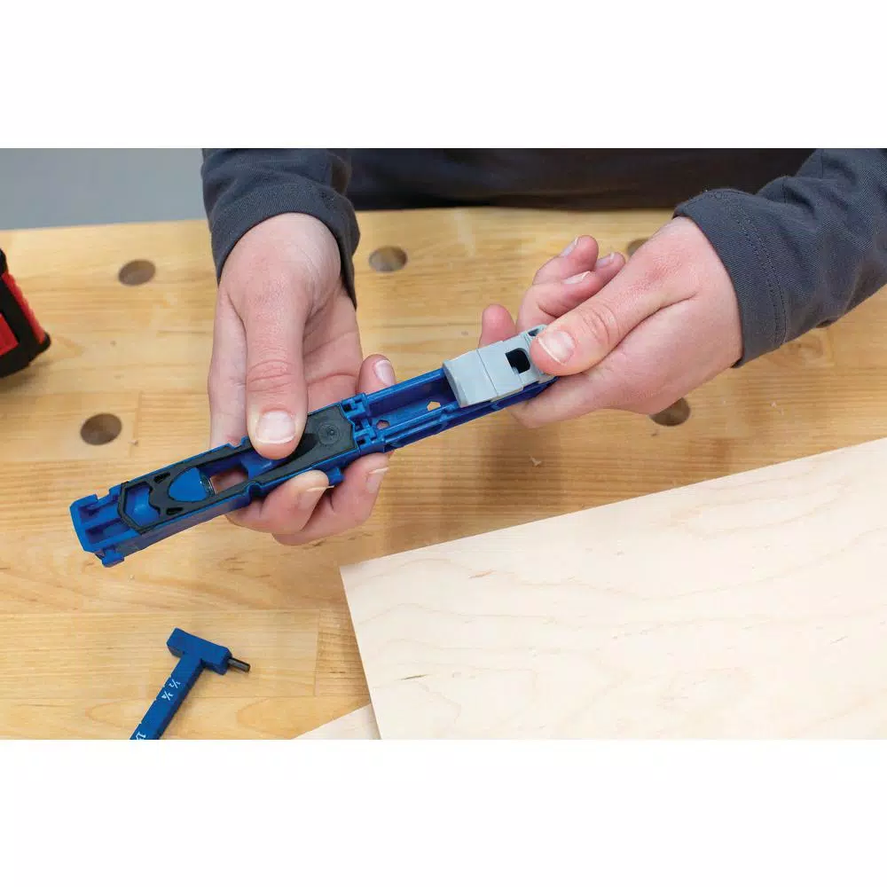 - Foolproof setup with a material-thickness gauge, positive stops and easy-set drill bit and stop collar