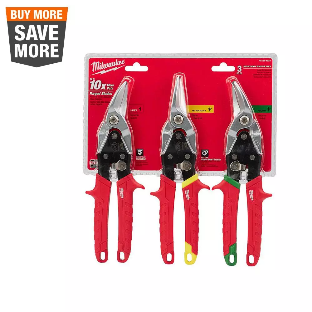These Milwaukee aviation snips are constructed with forged blades to deliver up to 10 times more cuts than cast blades. Built for long life and durability, these snips feature a bolt lock to ensure the blades don’t loosen, while a chrome-plated protection guards against rust. You can easily operate the snips with one hand. The flush pivot bolt won’t get hung up on materials, so you can use the tool easily. A metal lock secures it for storage. This 3-piece set includes left, right and straight aviation snips.