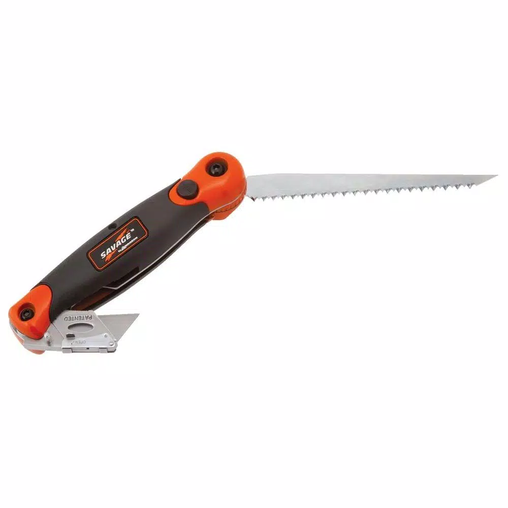 The Savage Folding Jab Saw/Utility Knife is one heavy-duty tool that is both a saw and an integrated utility knife, cleverly designed in a rugged metal case with a comfortable, cushioned handle. An industrial, screw-down bolt holds blades tight, but they can be changed easily and fast. The tool accepts any reciprocating saw blade, so you can use it for dozens of projects, from trimming trees to cutting metal conduit or plastic pipe. And it’s the perfect drywall saw. Saw blades can be locked in a straight or angled position for maximum flexibility. The onboard utility knife is top quality. It comes with a sturdy carrying case that holds the tool and extra blades, with a built-in belt clip, three saw blades and a utility blade.