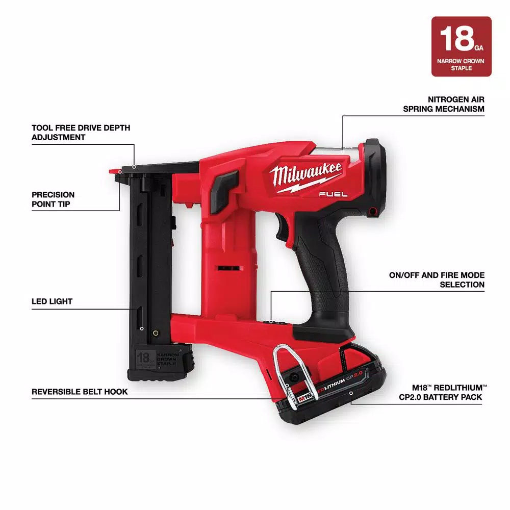 The MILWAUKEE M18 FUEL 18GA ¼” Narrow Crown Stapler Kit delivers peak productivity, providing users with unmatched stapling performance without the hassle of a compressor and hose. A nitrogen air spring mechanism gives this cordless staple gun power to consistently sink staples to the proper depth in hard materials with the ability to adjust to drive staples in soft materials without blowing through. The combination of a POWERSTATE Brushless Motor and REDLINK PLUS Intelligence provides an unmatched fire rate with zero ramp-up time, keeping users efficient throughout the day. This battery powered narrow crown stapler is compact and lightweight, giving users better access into tight spaces and limiting fatigue throughout the day. The M18 FUEL 18GA ¼” Narrow Crown Stapler delivers the pneumatic performance that professional carpenters and remodelers expect with the freedom and convenience of a cordless tool. The tool includes two work contact tips and a reversible belt hook. In addition to the narrow crown stapler, this kit includes two work contact tips, one M18 REDLITHIUM CP2.0 battery pack, an M18 & M12 Multi-Voltage Charger, reversible belt hook, and a contractor bag.