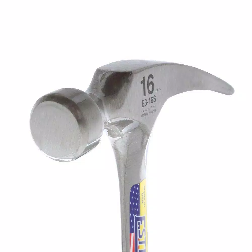 This 16 oz. rip claw nail hammer is forged in 1-piece solid steel, and fully polished. Balance and temper are unsurpassed. It has a bonded and molded on Shock Reduction Grip that reduces shock up to 70% and will not come off. Estwing hammers are the only hammers that can make this claim. Both the head and handle are forged in 1-piece solid steel and have an attractive blue UV coating. This is the perfect hammer for general, and light to medium duty. Nail hammers are designed for striking common and finishing nails and nail sets. Made in USA. Protect your eyes from flying particles and dust. Always wear safety goggles. Bystanders shall also wear safety goggles.