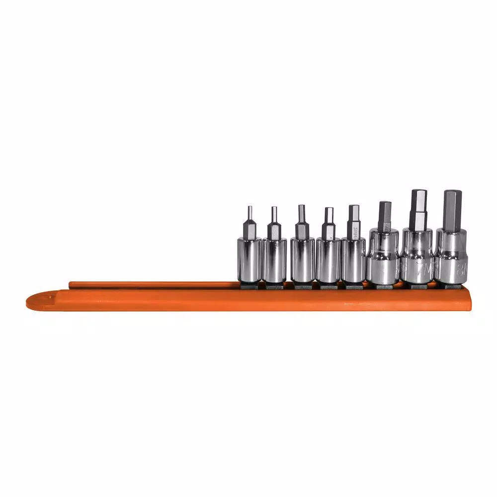 8-Piece Metric Hex Set includes sizes 2 mm, 2.5 mm, 3 mm, 4 mm, 5 mm, 6 mm, 7 mm and 8 mm. Socket bits can be used with the appropriate rachet, T-handle or socket spinner handle. Bits made from S2 tool steel with proprietary heat treat for superior strength and durability. Precision tip profile manufactured for positive and precise fastener engagement. Sockets made from alloy steel with proprietary heat treat for long life and lasting performance. Fully polished, chrome plated sockets for superior corrosion resistance. Design of socket and bit assembly allows for easy replacement of broket or worn bit. Tip sized appropriately to 1/4 in., 3/8 in. and 1/2 in. square drives for maximum torque and minimum damage to tips or fasteners. Bits and sockets made to exacting specifications. Comes with color coded storage rail.