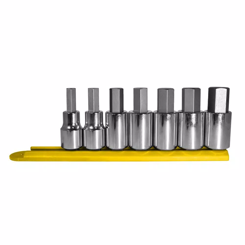 5-Piece Metric Hex Set includes sizes 10 mm, 12 mm, 14 mm, 17 mm and 19 mm. Socket bits can be used with the appropriate rachet, T-handle or socket spinner handle. Bits made from S2 tool steel with proprietary heat treat for superior strength and durability. Precision tip profile manufactured for positive and precise fastener engagement. Sockets made from alloy steel with proprietary heat treat for long life and lasting performance. Fully polished, chrome plated sockets for superior corrosion resistance. Design of socket and bit assembly allows for easy replacement of broket or worn bit. Tip sized appropriately to 1/4 in., 3/8 in. and 1/2 in. square drives for maximum torque and minimum damage to tips or fasteners. Bits and sockets made to exacting specifications. Comes with color coded storage rail.
