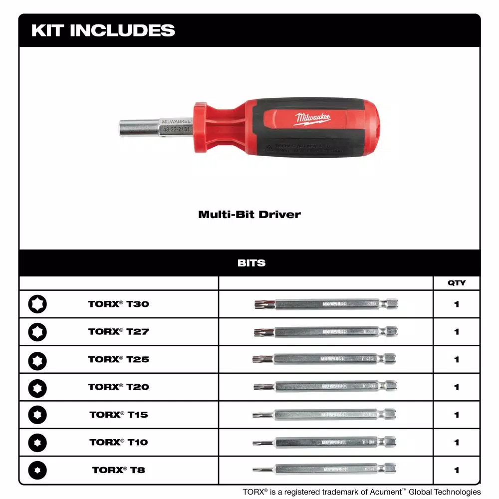 The Milwaukee 9-in-1 TORX Key Drive Multi-Bit Driver features 3-1/2 in. interchangeable power groove bits that are power tool compatible providing users with maximum job site versatility. The multi-bit screwdriver also has wrench-ready hex shanks giving users additional leverage. The interchangeable bits are precision machined and chrome-plated, providing marine-grade rust protection and reduced wear providing users with the best job site durability. The compact screwdriver features magnetic bit retention giving users consistent driving performance. The Milwaukee 9-in-1 TORX Key Drive Multi-Bit Driver is designed for the job site and includes Milwaukee’s Limited Lifetime Warranty.