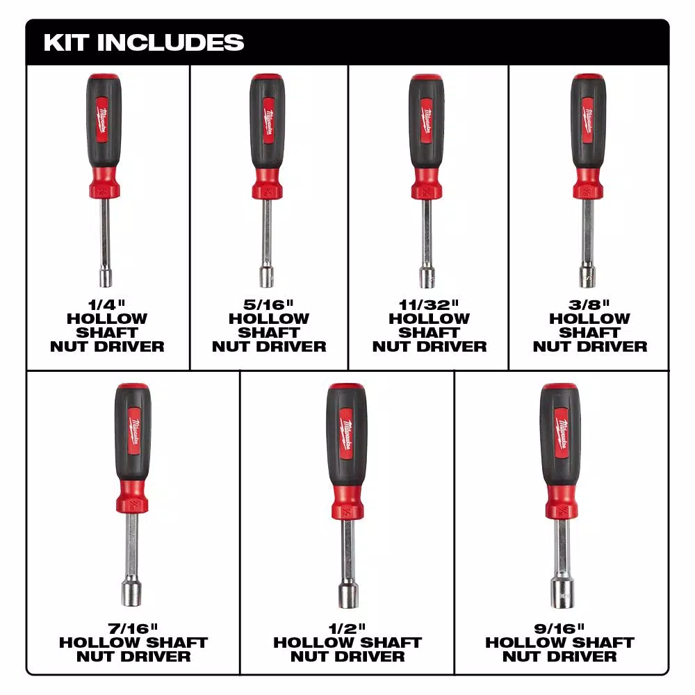 - Sizes included: 1/4 in., 5/16 in., 11/32 in., 3/8 in., 7/16 in., 1/2 in. and 9/16 in.