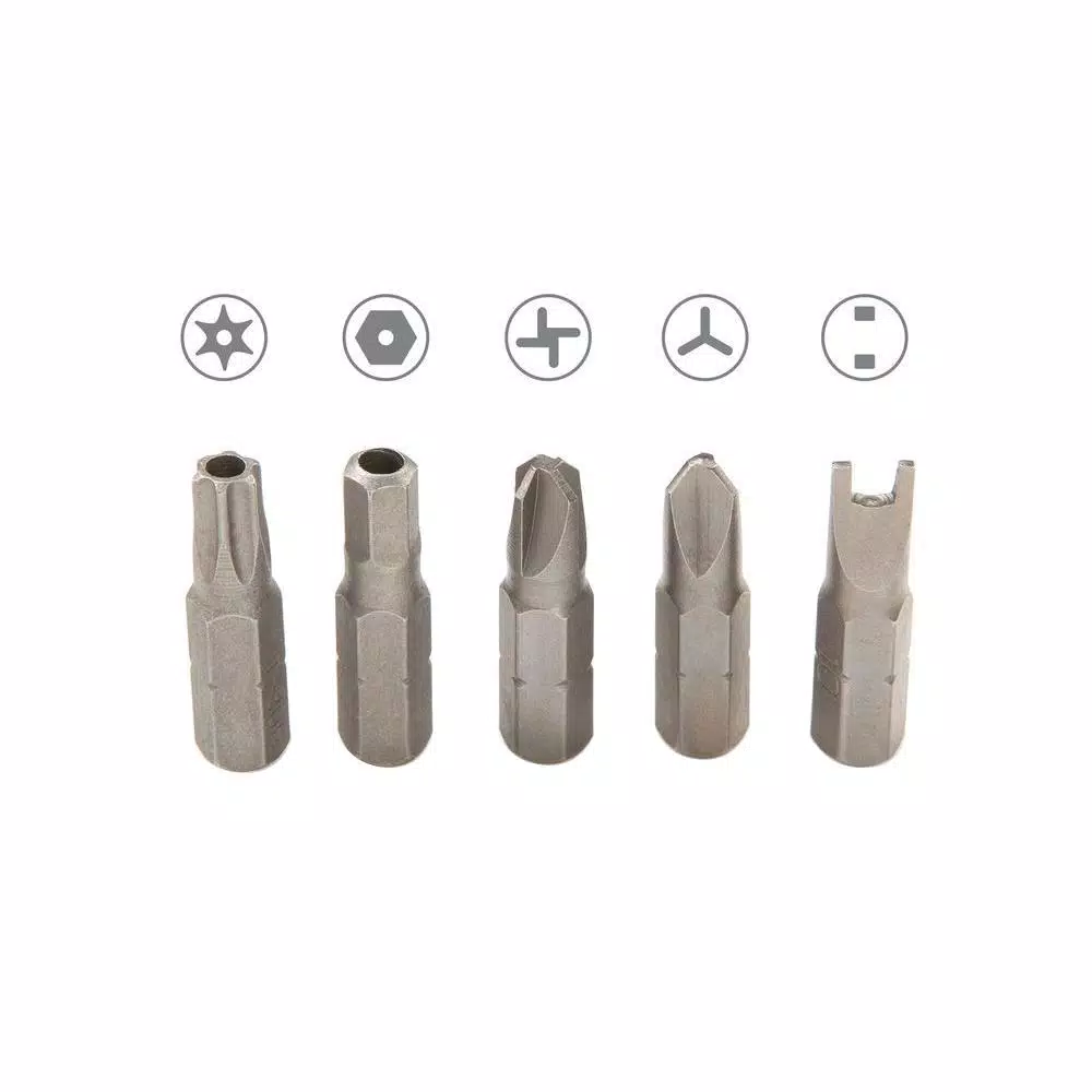 - Security bits drive five types of tamper-resistant screws