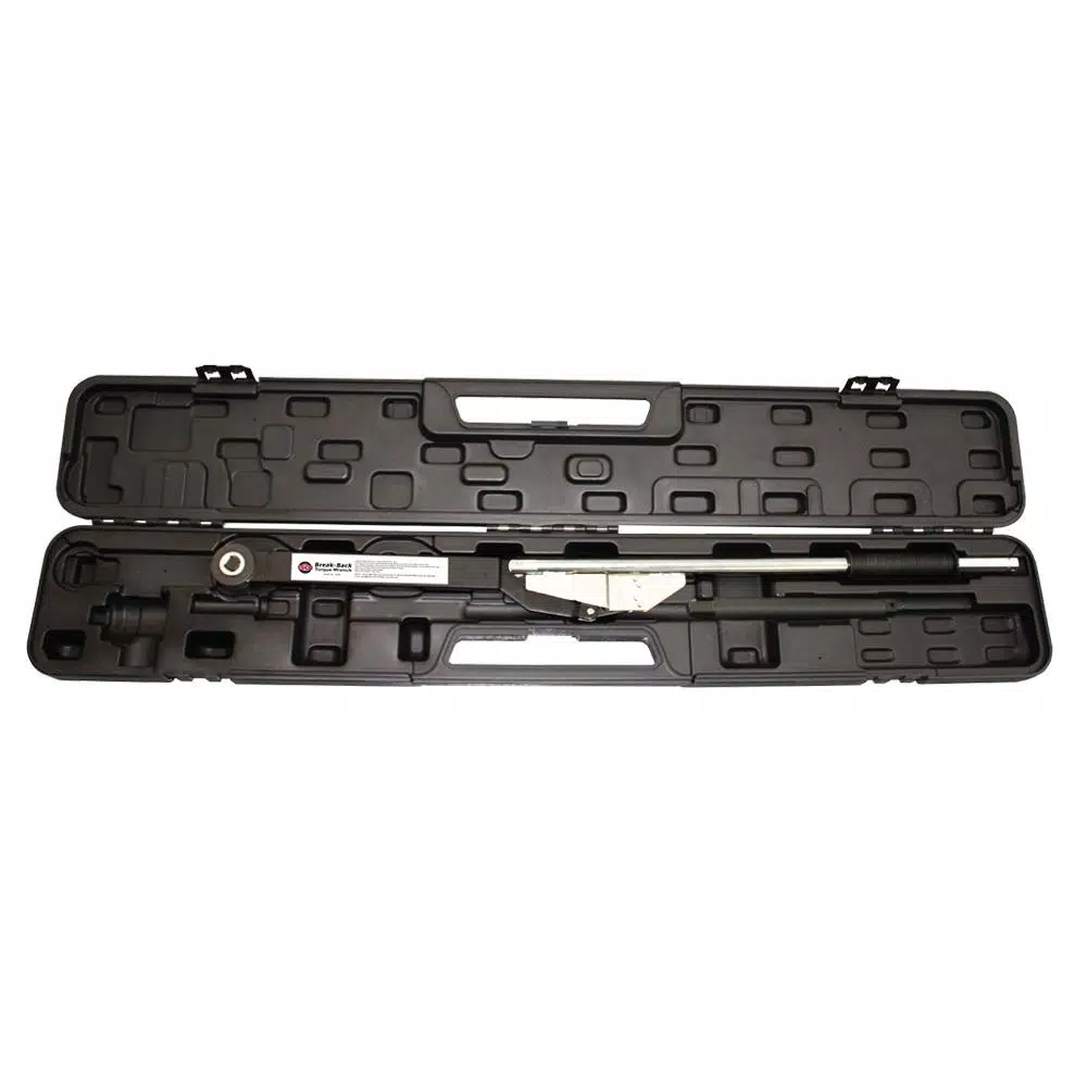 This professional grade break-back style torque wrench offers a 200 ft. – 750 ft. lbs. range which can be used for many applications. Easily set an infinite range of torque values with extremely high accuracy by adjusting the dial on the handle to the desired torque value. When the preset torque value is reached, a reliable control mechanism allows the wrench to physically bend in the middle, which alerts the operator that torque has been met. This tool comes pre-calibrated to an accuracy of +/- 4%, ready to use right out of the box. Includes a heavy-duty molded carrying case for easy transport and storage.