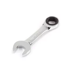 TEKTON Stubby Ratcheting Combination Wrenches offer the speed and ease of a ratcheting box end that stays continuously engaged with fasteners, eliminating the need to re-fit after each turn. Sized to go where others cannot, a short length makes it easy to operate in confined areas. A 6-point opening provides a sure, snug fit on hex-shaped fasteners so you can apply maximum torque without slipping off, saving aggravation and your knuckles. To prevent round-off, the box end opening contacts and applies force to the flat sides of fastener heads rather than the corners. Equipped with a 72-tooth ratchet gear that needs just 5° of swing arc to reach the next tooth position, it is fast and efficient when there is not much room to move. The open end is angled 15°, allowing the wrench to be flipped over with each rotation to engage the fastener twice as often when you are working in tight spaces.