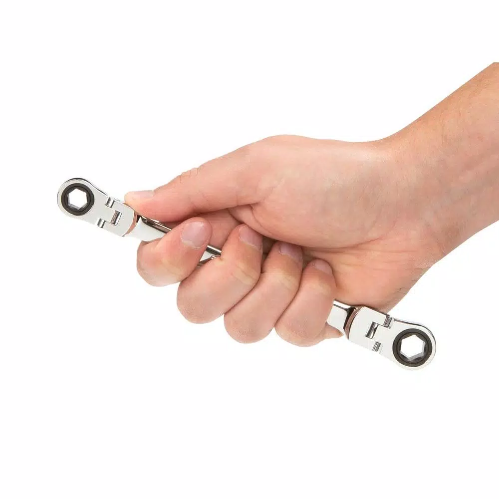 TEKTON Flex-Head Ratcheting Box End Wrenches offer the speed and ease of ratcheting box ends that stay continuously engaged with fasteners, eliminating the need to re-fit after each turn. Smoothly pivoting through 180°, the heads hold any angle to slide onto fasteners. They are free to move with each stroke, allowing the wrench to navigate around obstructions along the swing path. The 6-point openings provide a sure, snug fit on hex-shaped fasteners so you can apply maximum torque without slipping off, saving aggravation and your knuckles. To prevent round-off, the openings contact and apply force to the flat sides of fastener heads rather than the corners. Equipped with 72-tooth ratchet gears that need just 5° of swing arc to reach the next tooth position, it is fast and efficient when there is not much room to move.