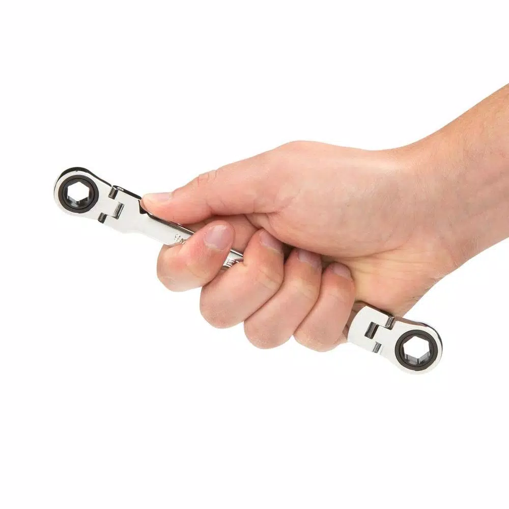 TEKTON Flex-Head Ratcheting Box End Wrenches offer the speed and ease of ratcheting box ends that stay continuously engaged with fasteners, eliminating the need to re-fit after each turn. Smoothly pivoting through 180°, the heads hold any angle to slide onto fasteners. They are free to move with each stroke, allowing the wrench to navigate around obstructions along the swing path. The 6-point openings provide a sure, snug fit on hex-shaped fasteners so you can apply maximum torque without slipping off, saving aggravation and your knuckles. To prevent round-off, the openings contact and apply force to the flat sides of fastener heads rather than the corners. Equipped with 72-tooth ratchet gears that need just 5° of swing arc to reach the next tooth position, it is fast and efficient when there is not much room to move.